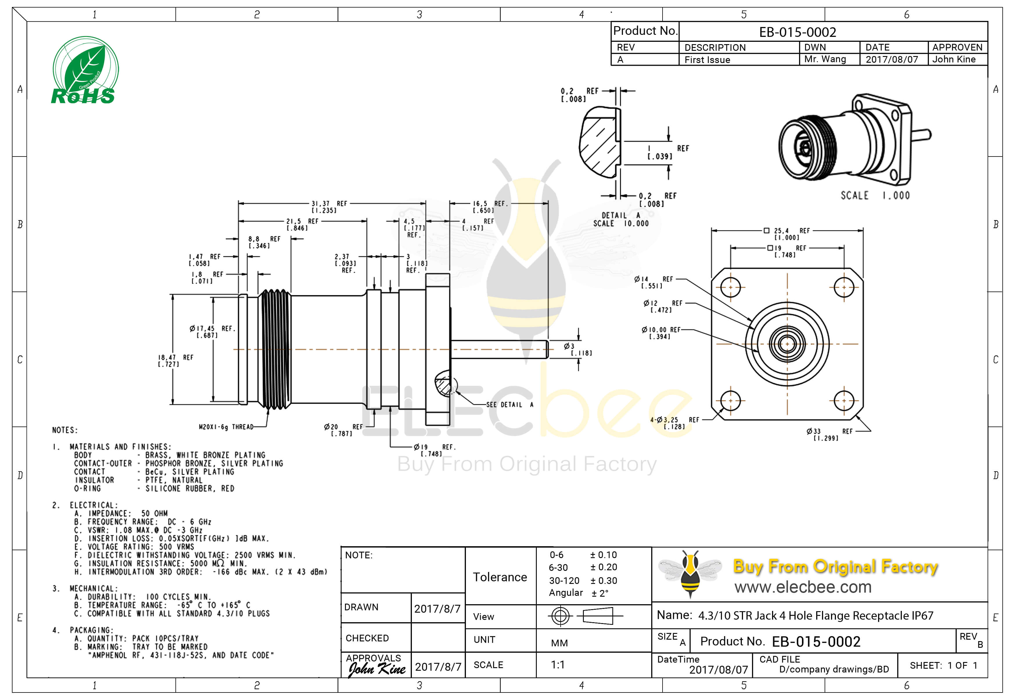 - RF连接器,4.3-10连接器,直式,母头,螺母锁紧,,四孔法兰,插孔,50欧姆