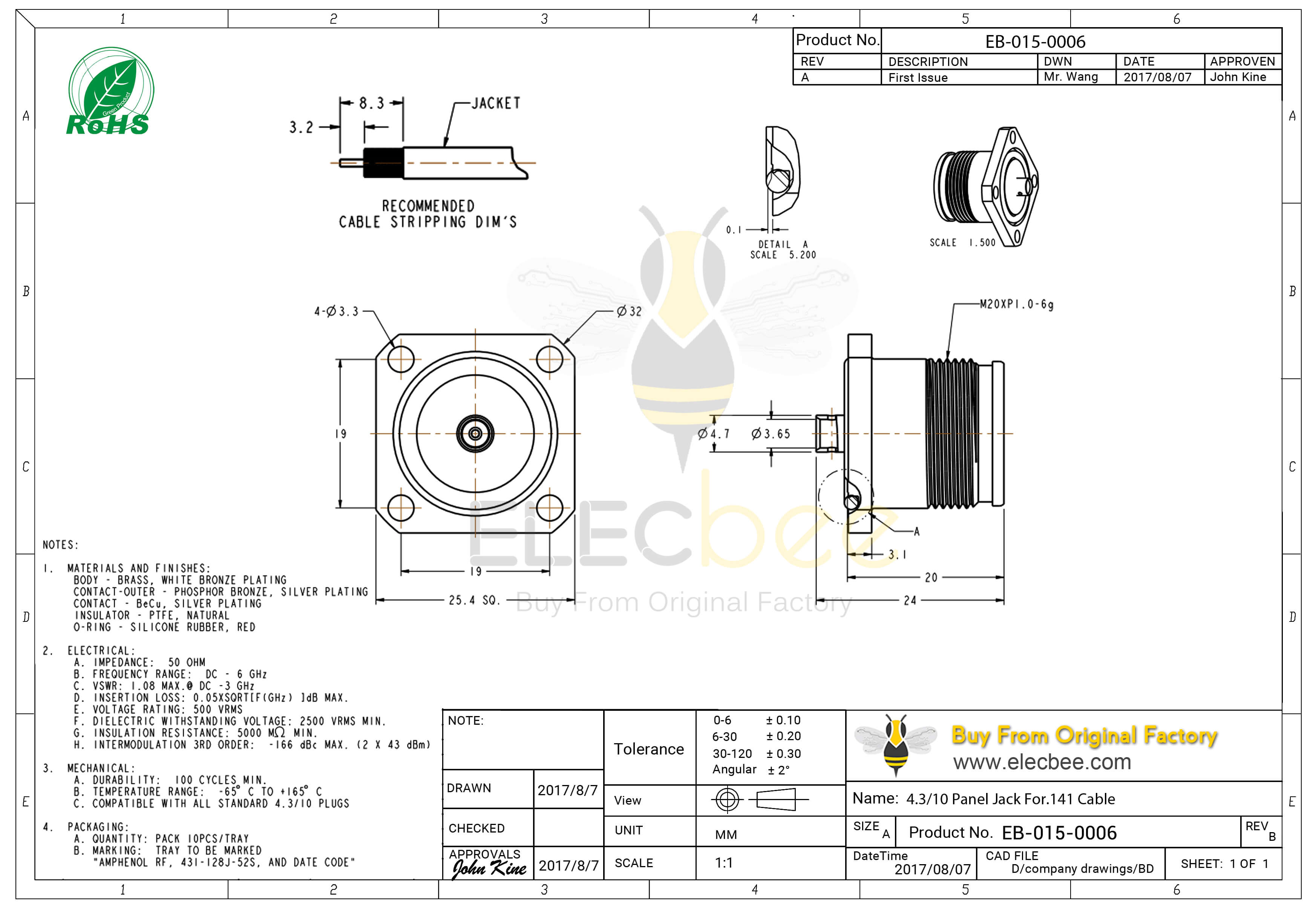 - RF连接器,4.3-10连接器,直式,母头,螺母锁紧,接.141" 半刚性线,四孔法兰,50欧姆,防水