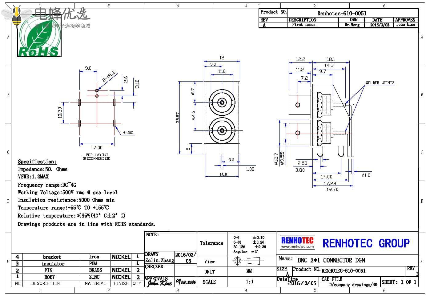 - PCB板端,母头,弯式,锌合金,RF射频同轴,BNC连接器,50欧姆;