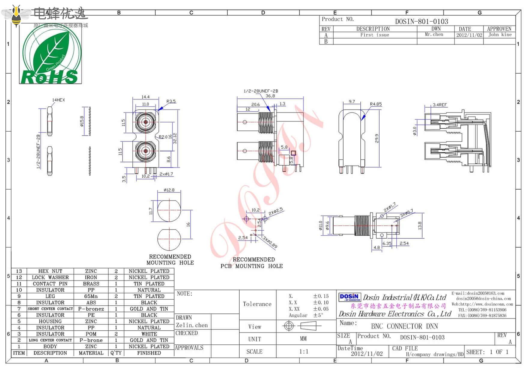 - PCB板端,母头,弯式,锌合金,RF射频同轴,BNC连接器,75欧姆,穿墙;