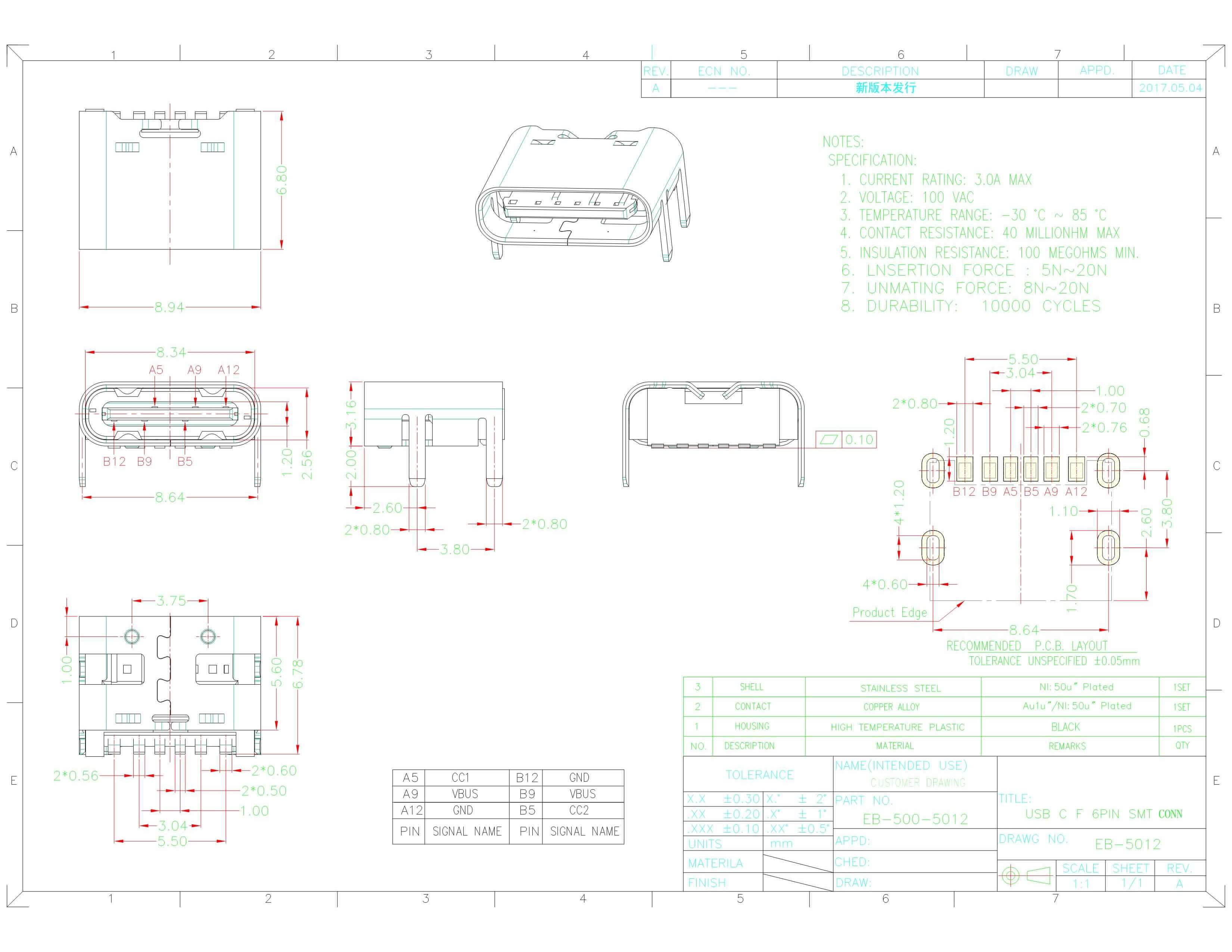 - USB3.0,Type C,母头,弯头,插孔,SMT,接PCB板
