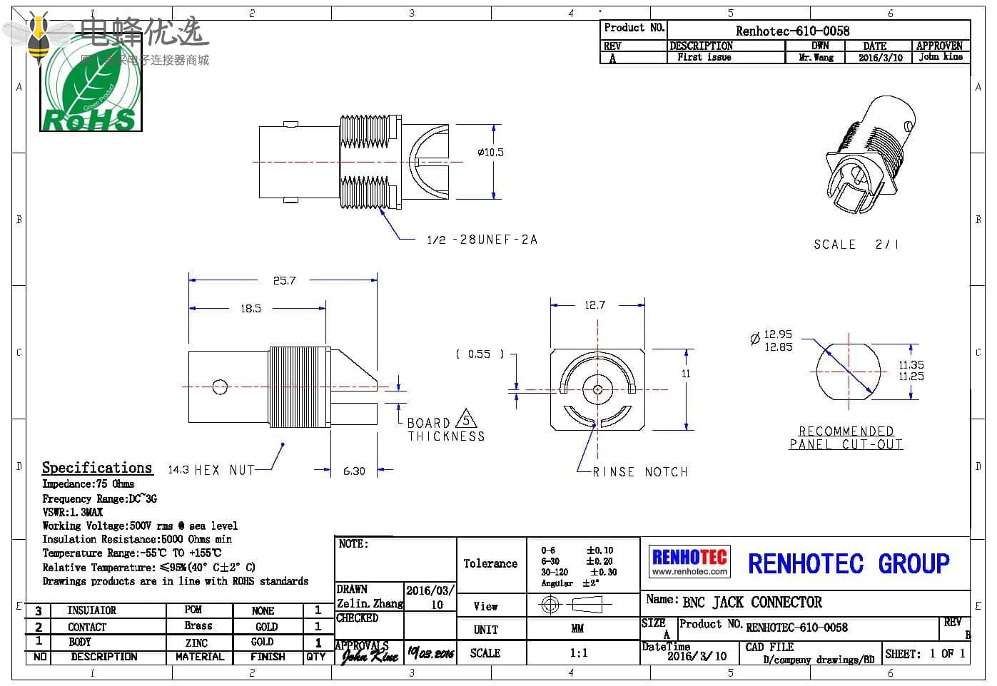 - 中心接触电阻:≦ 1.5 mΩ (Milliohms max.)