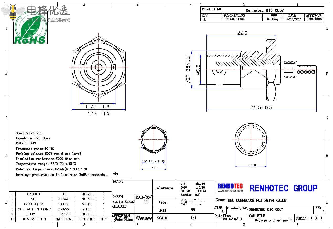 - 连接线,母头,直式,锌合金,50欧姆,RF射频同轴,BNC连接器,电缆,穿墙;