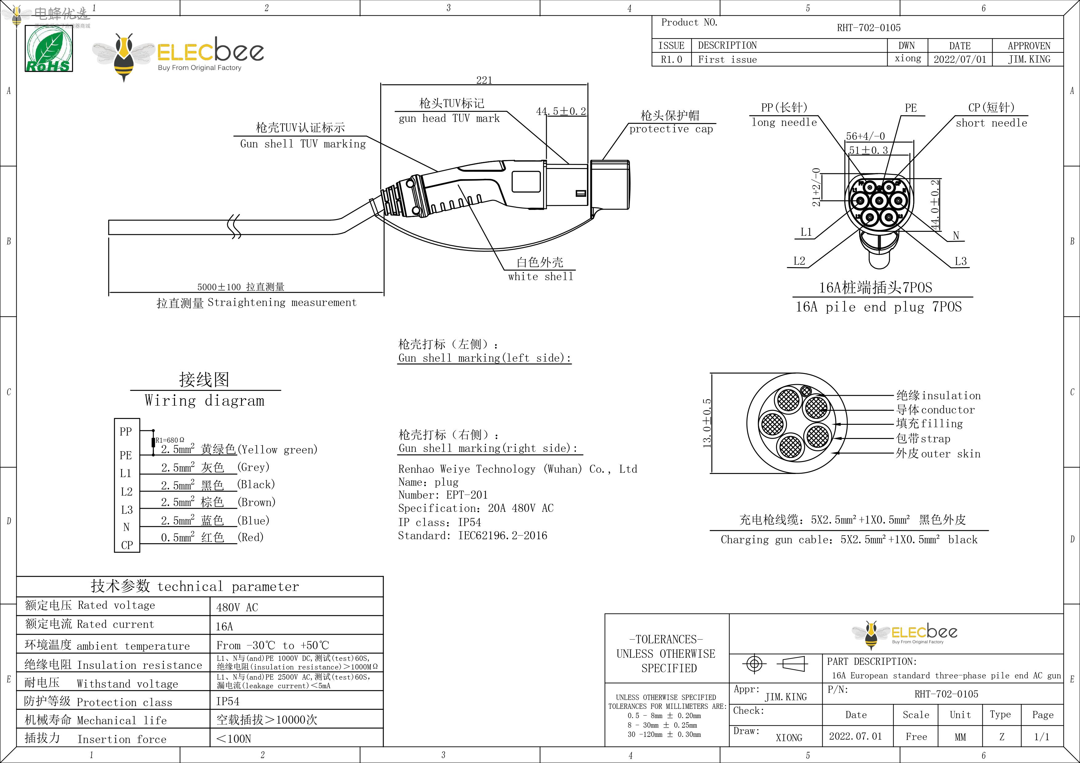 16A欧标三相桩端交流枪线缆:5X2.5mm²+1X0.5mm² 黑色外皮