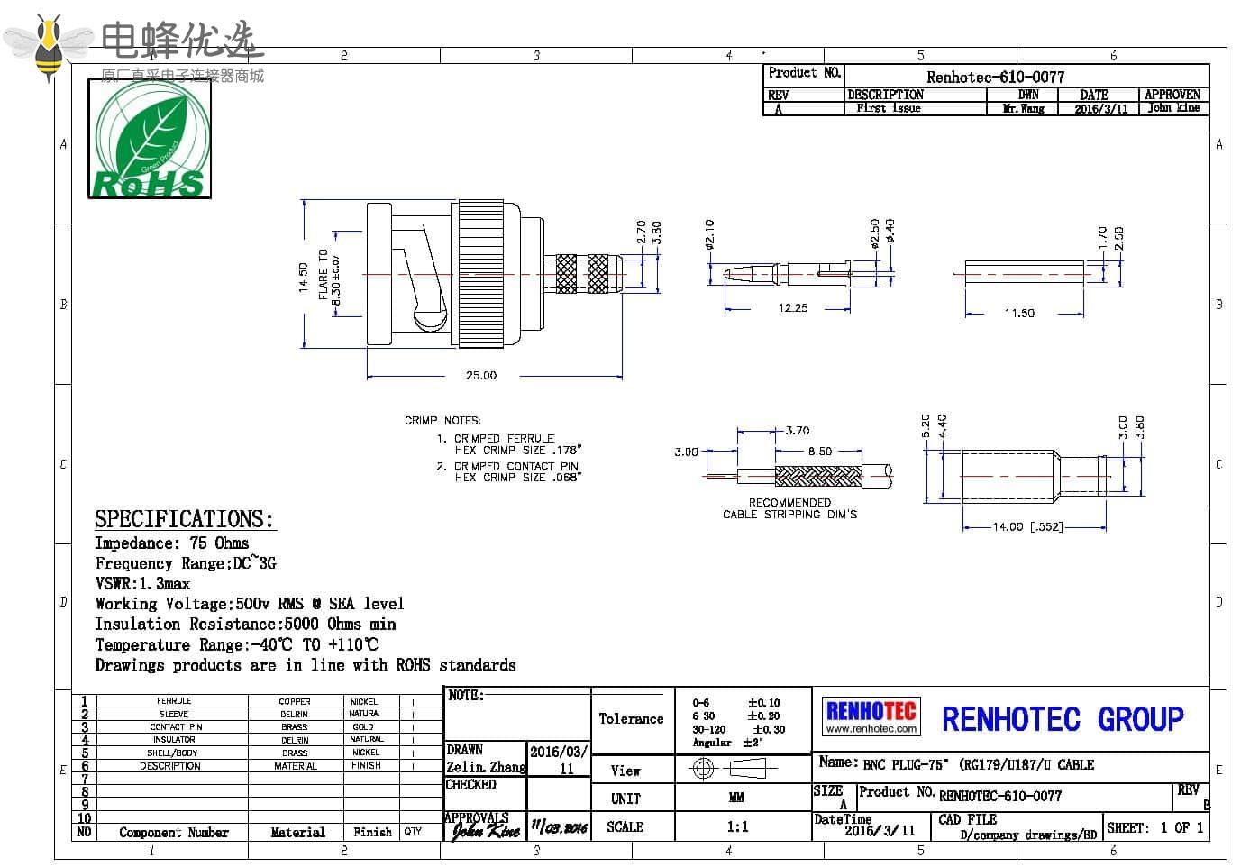 - 阻抗: 75 ohm