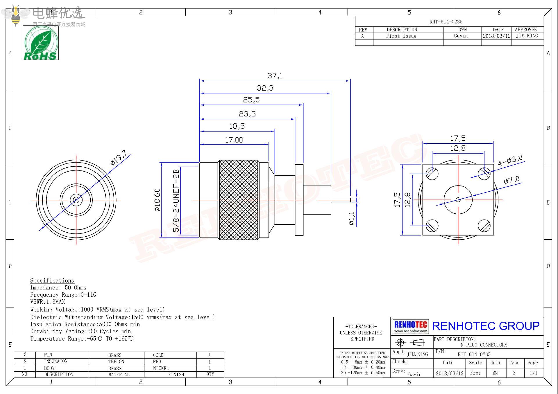 - 高性能连接器,频率范围达0到11GHz,阻抗50欧姆;