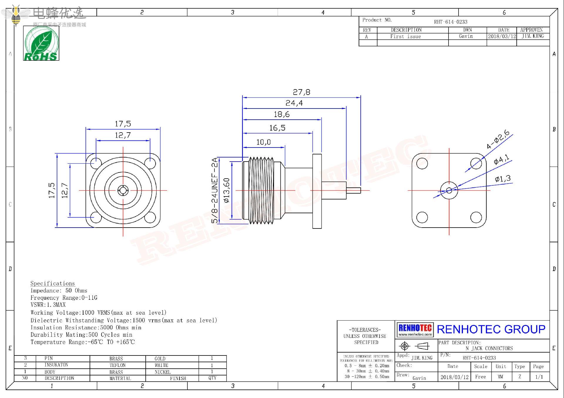 - 中心接触电阻: ≦ 1.0 mΩ (Milliohms max.)