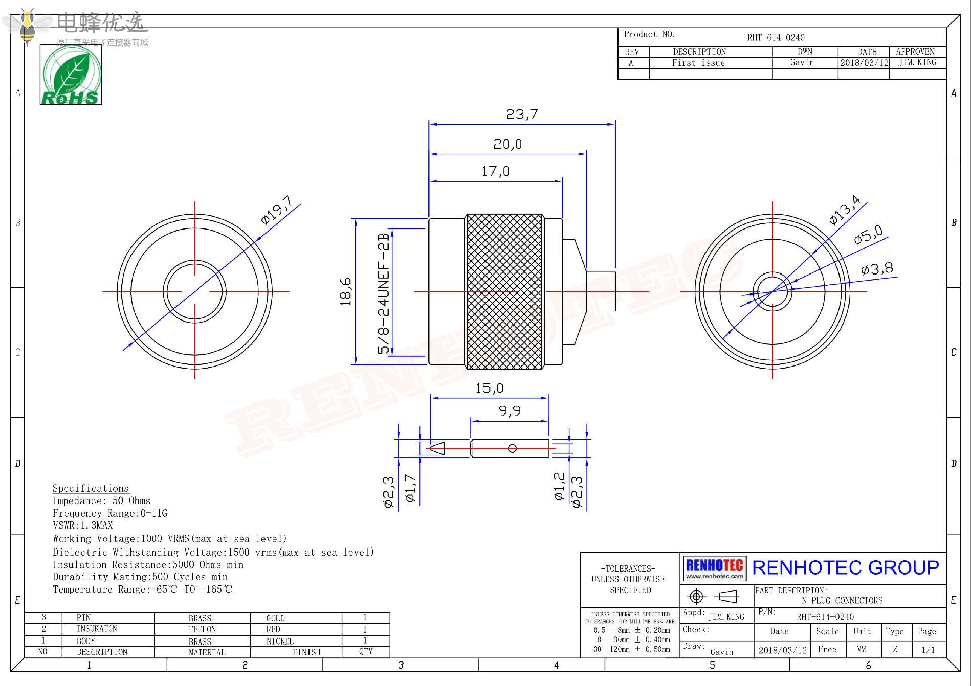 - 高性能连接器,频率范围达0到11GHz,阻抗50欧姆;