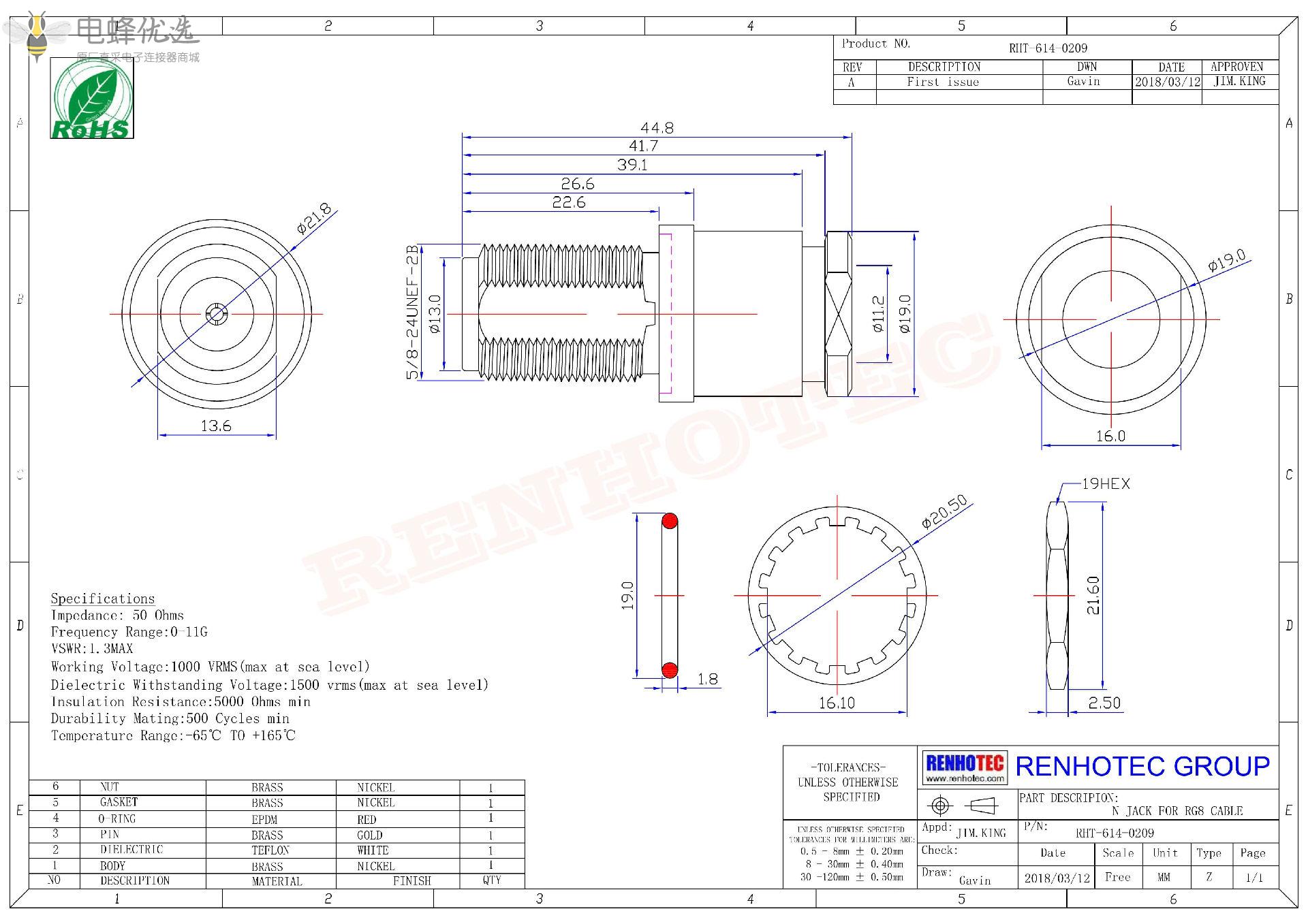 - 中心接触电阻: ≦ 1.0 mΩ (Milliohms max.)