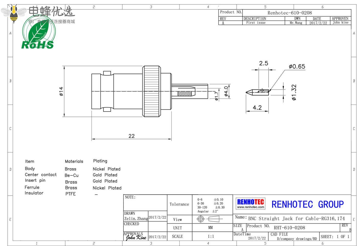 - 中心接触电阻:≦ 1.5 mΩ (Milliohms max.)