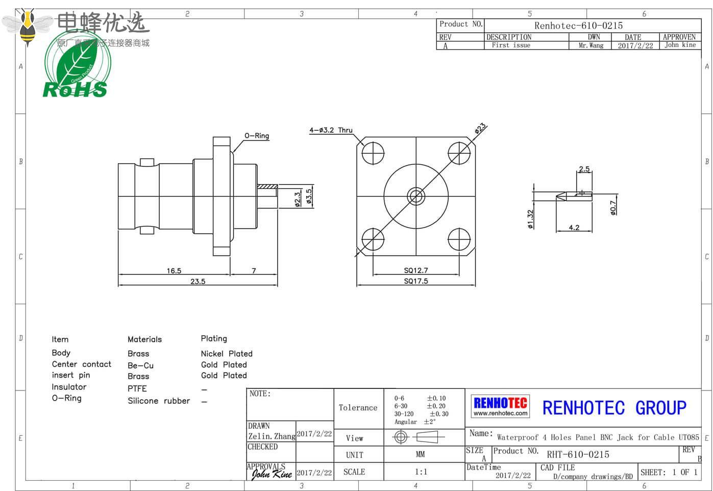 - 中心接触电阻:≦ 1.5 mΩ (Milliohms max.)