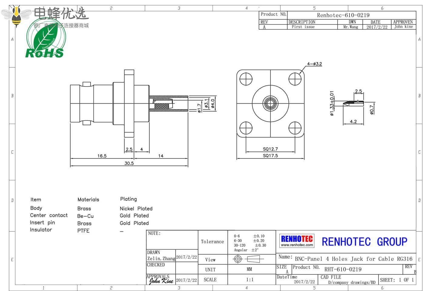 - 中心接触电阻:≦ 1.5 mΩ (Milliohms max.)