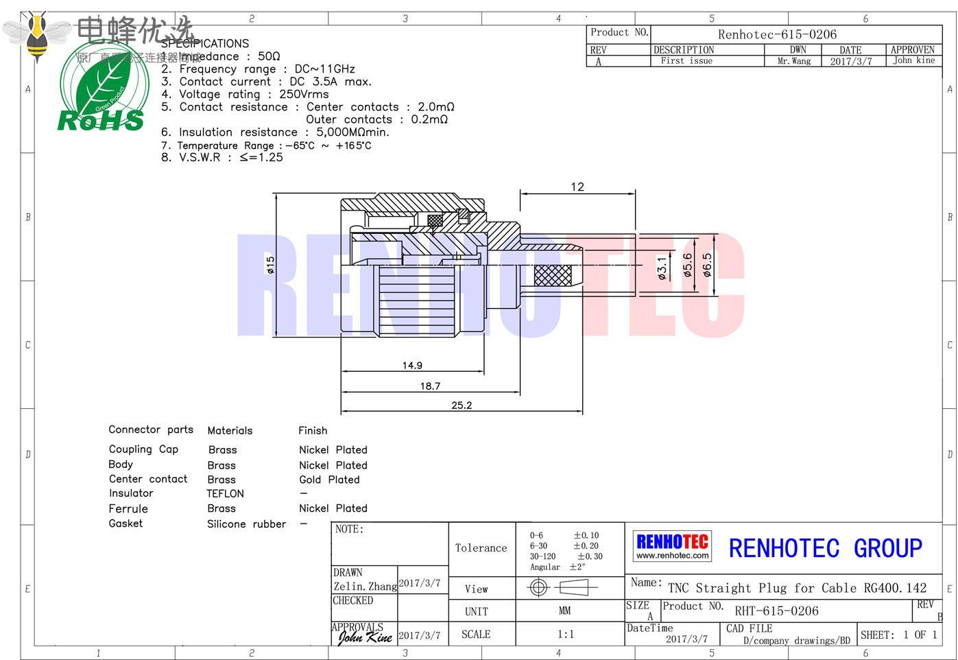 - 同轴线缆,插头,直式,压接,tnc连接器,RG142,RG400,反极;