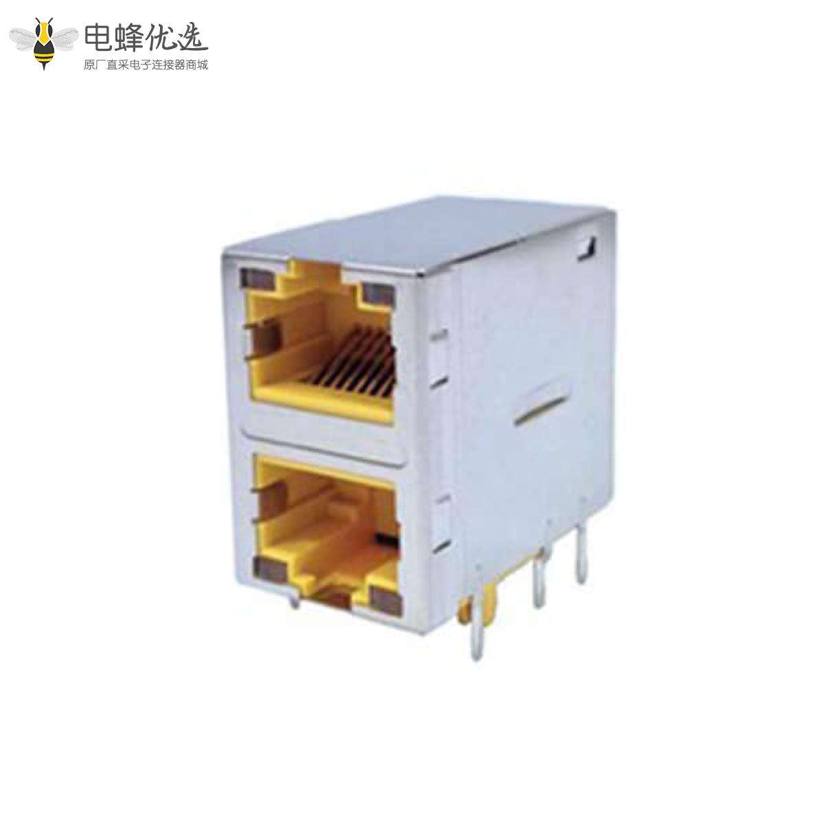 - RJ45连接器,母座,PCB板,8P8C,2*1,双层,2口,弯式,非屏蔽,不带弹片,不带灯,不带滤波器,铜壳,镀镍;