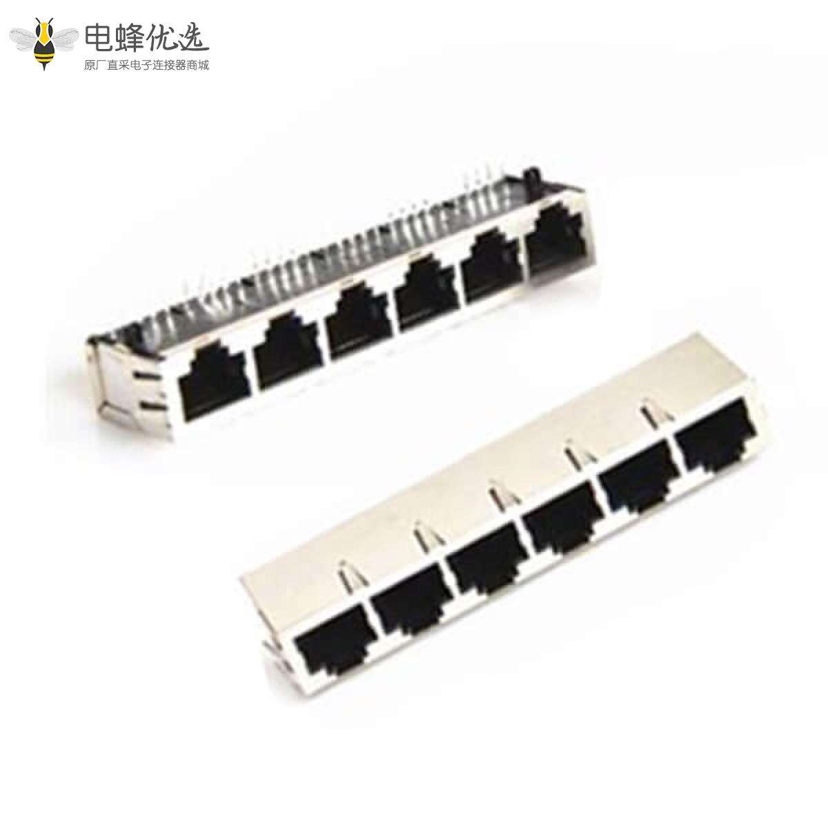 - RJ45连接器,母座,PCB板,8P8C,1*5,单层,5口,弯式,屏蔽,带弹片,不带灯,不带滤波器,铜壳,镀镍;