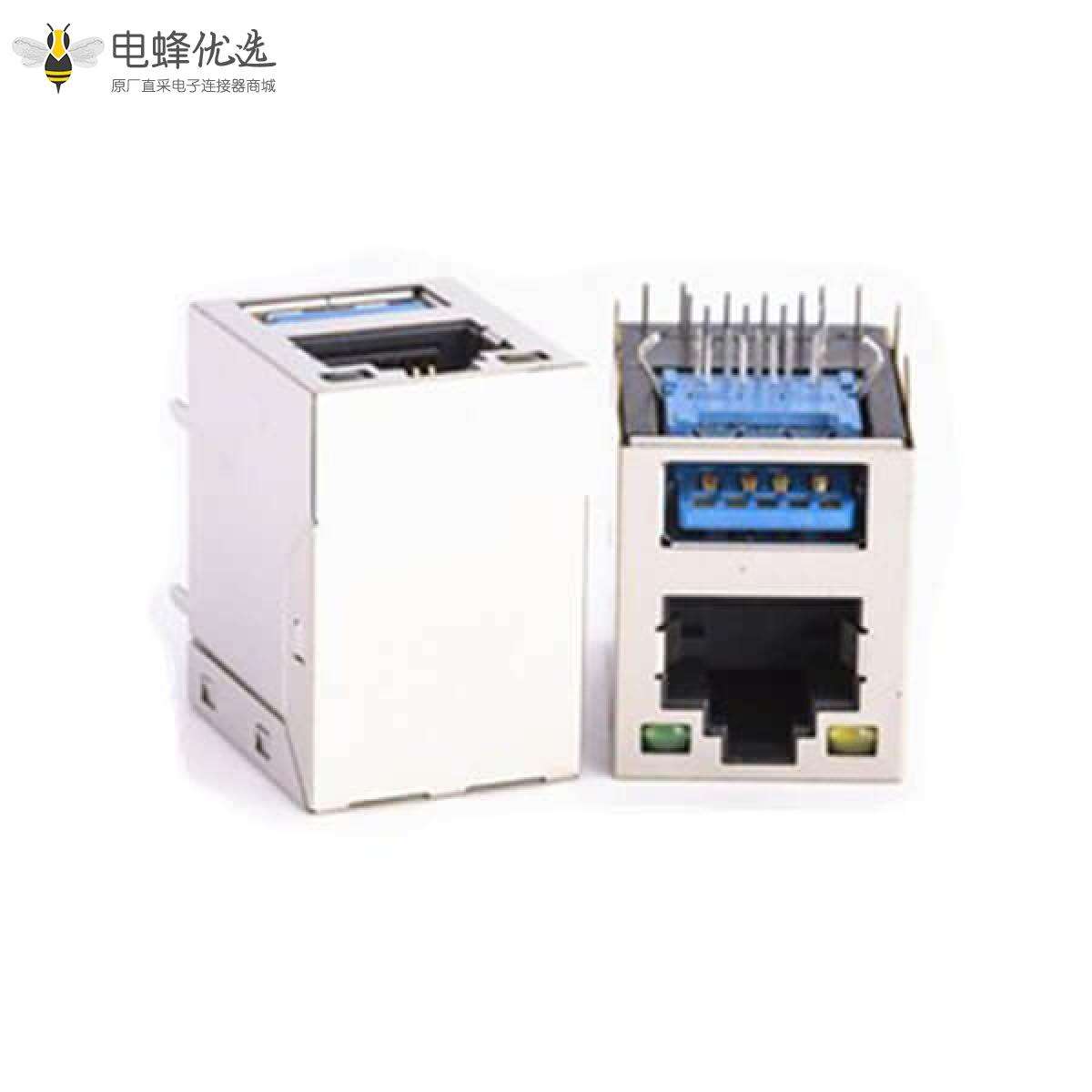 - RJ45和单层USB3.0连接器,母座,PCB板,8P8C,2*1,双层,2口,弯式,屏蔽,不带弹片,带灯,不带滤波器,铜壳,镀镍;