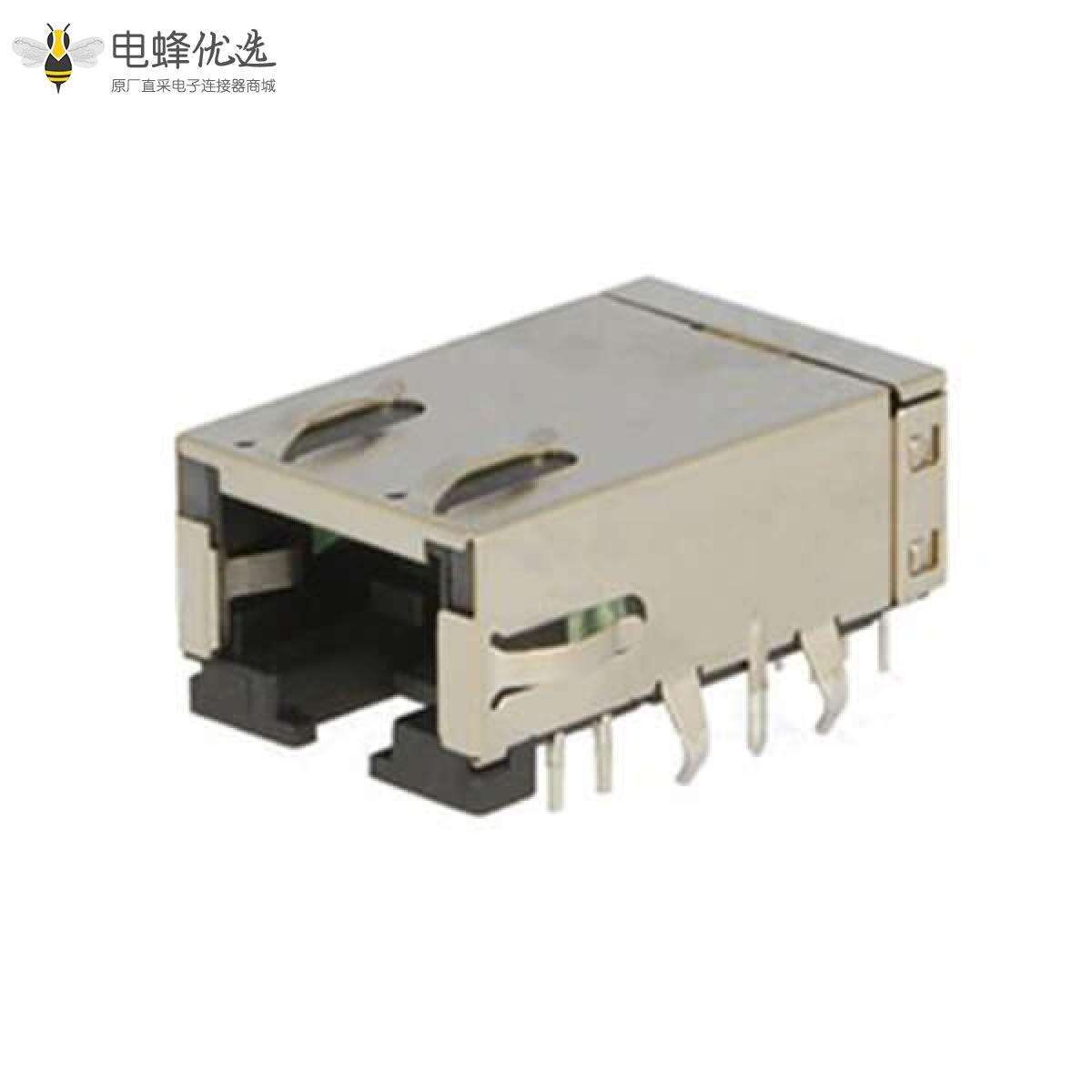 - RJ45连接器,母座,PCB板,8P8C,1*1,单层,单口,弯式,屏蔽,带弹片,带灯,不带滤波器,铜壳,镀镍;
