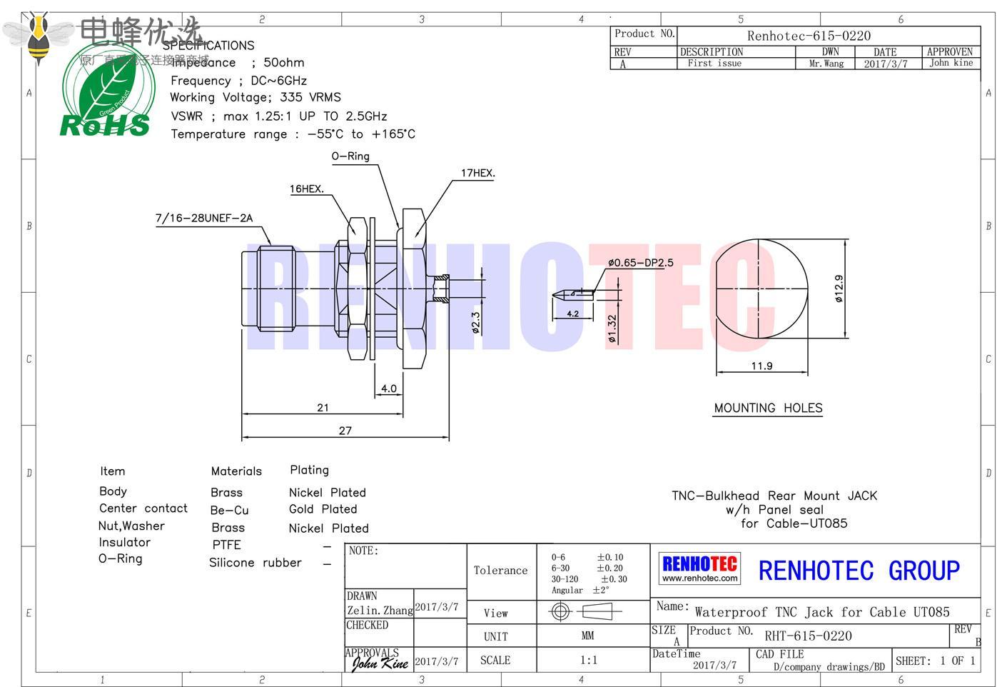 直式穿墙50欧姆反极插座头面板安装接线UT085tnc射频连接器