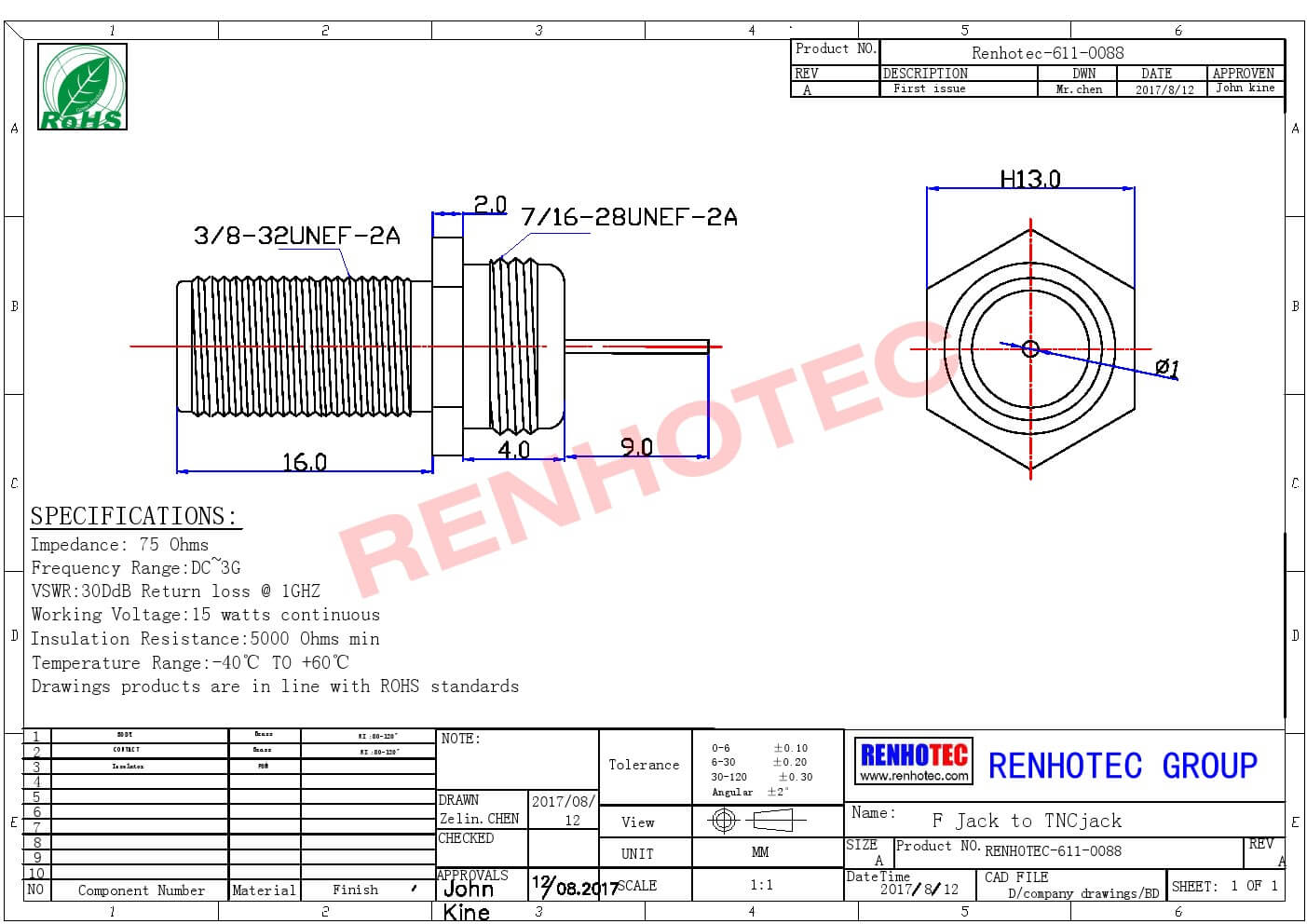 - F转TNC,母转母,直式,75欧姆,穿墙,同轴连接器;