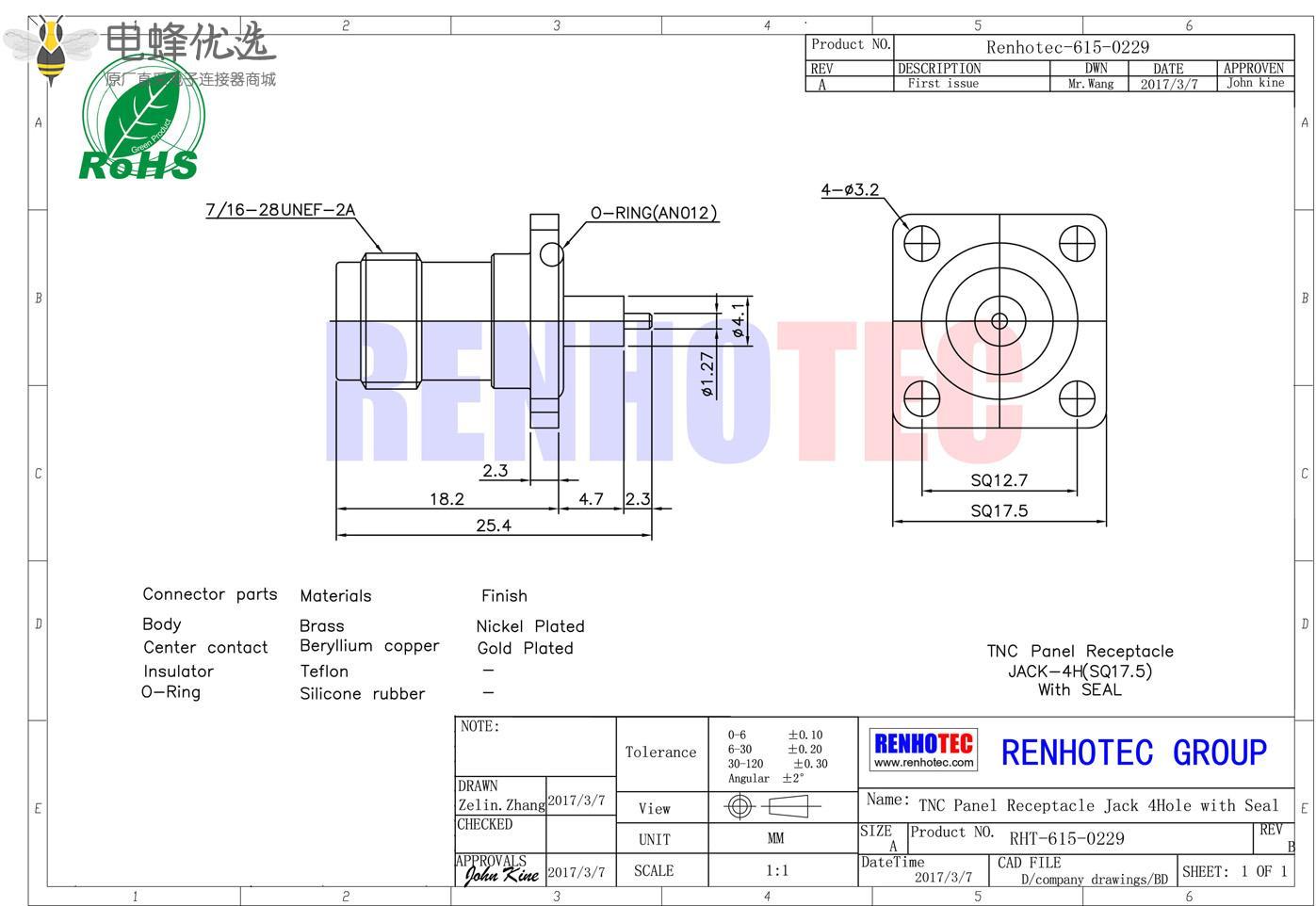 - 面板安装,母头,直式,4孔法兰,tnc连接器;
