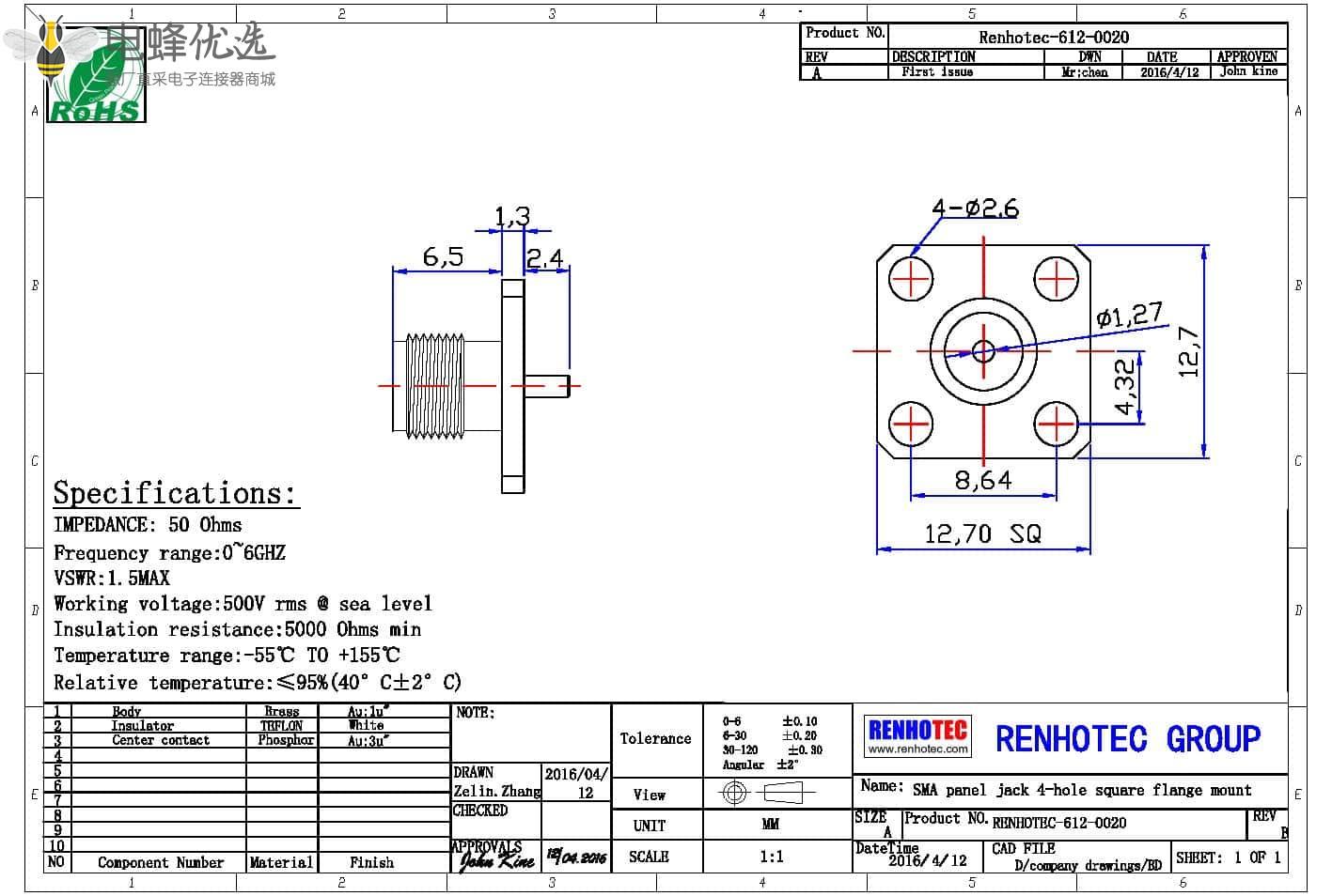 接RG142,RG405线缆时为170 V rms - 中心接触电阻:≦ 6.0mΩ (Milliohms max.)
