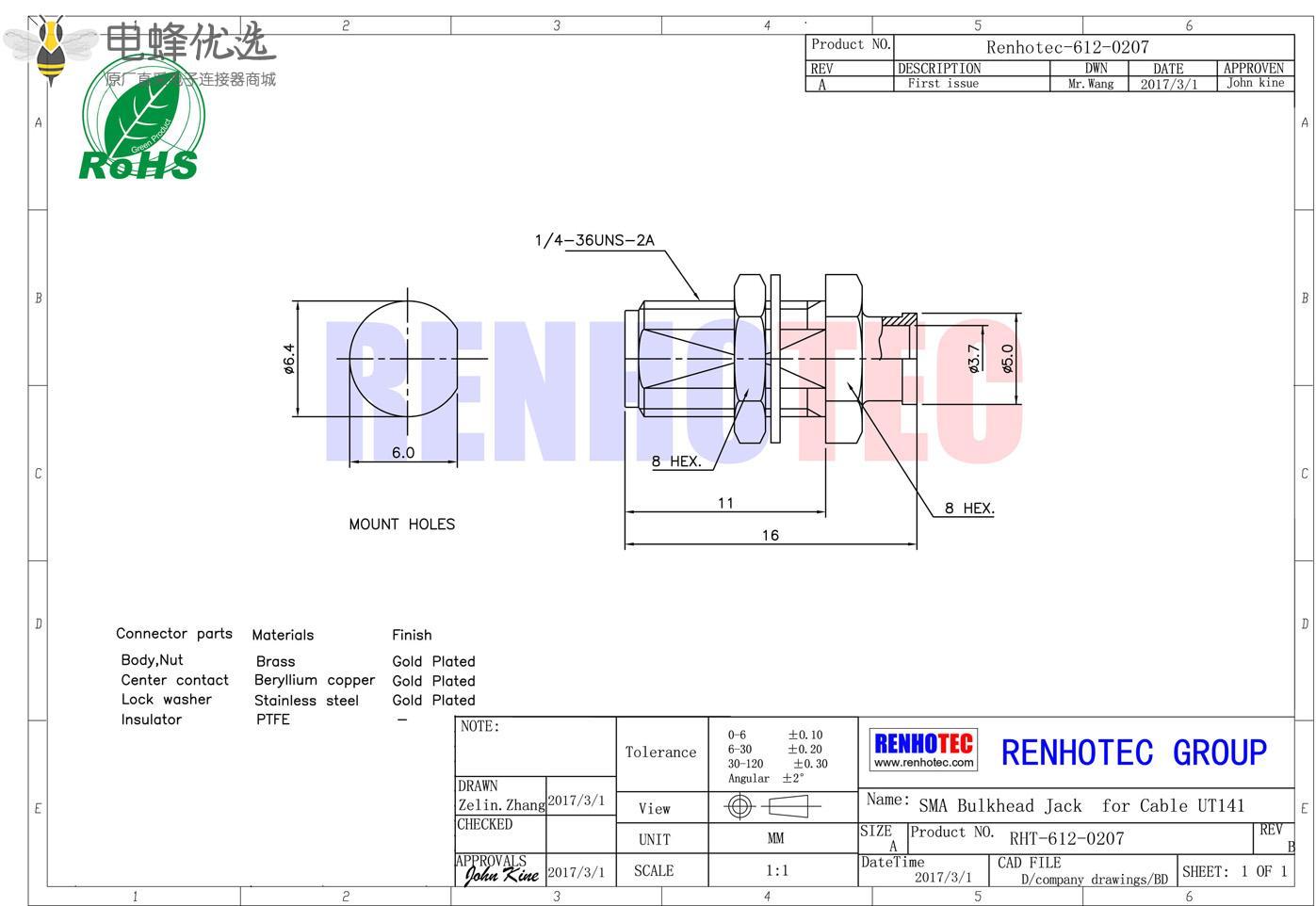 - sma连接器,穿墙,焊接,直式,母头,同轴线缆,UT141;