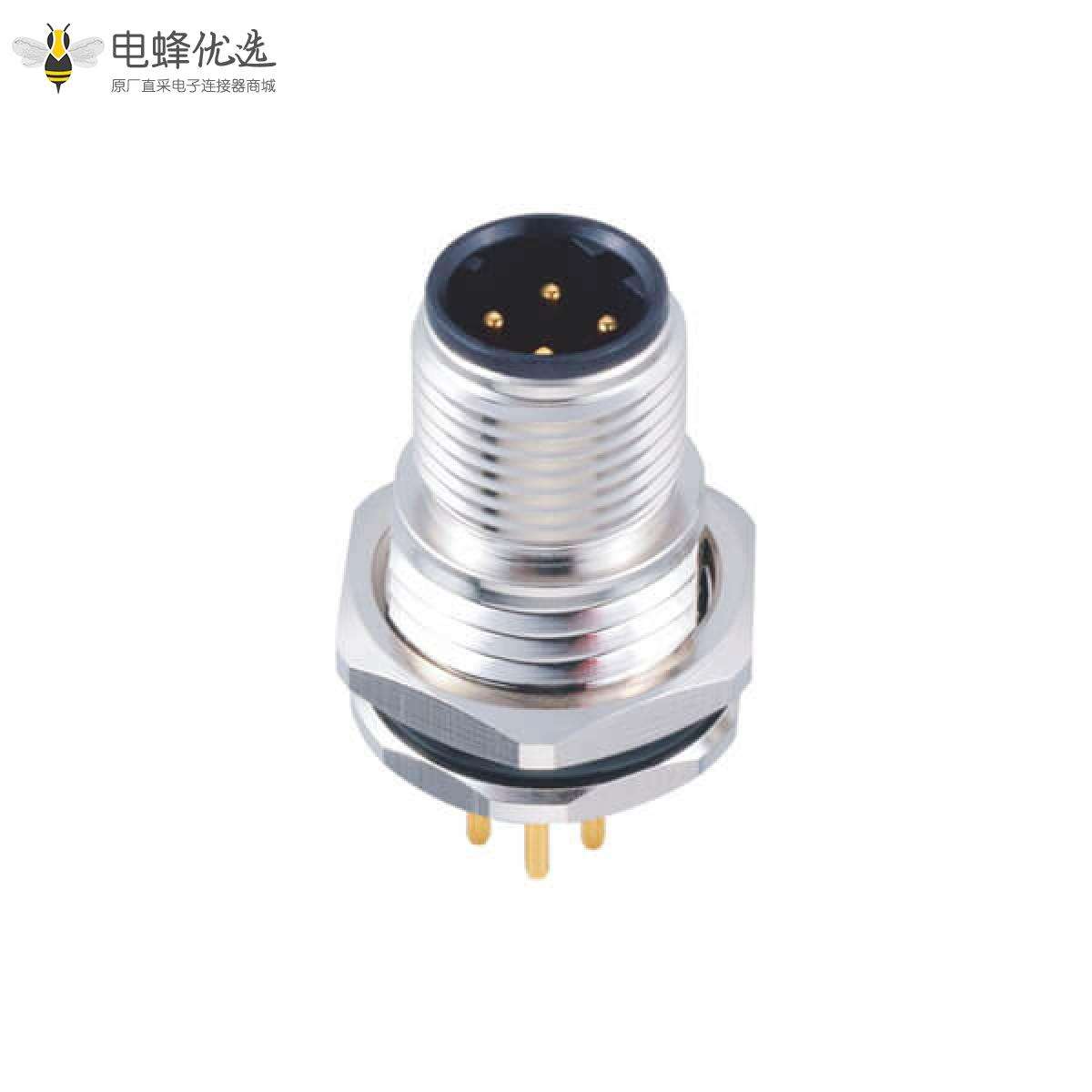 M12,板端插座,D Code,4芯,直式,公头,接PCB板,前锁板;