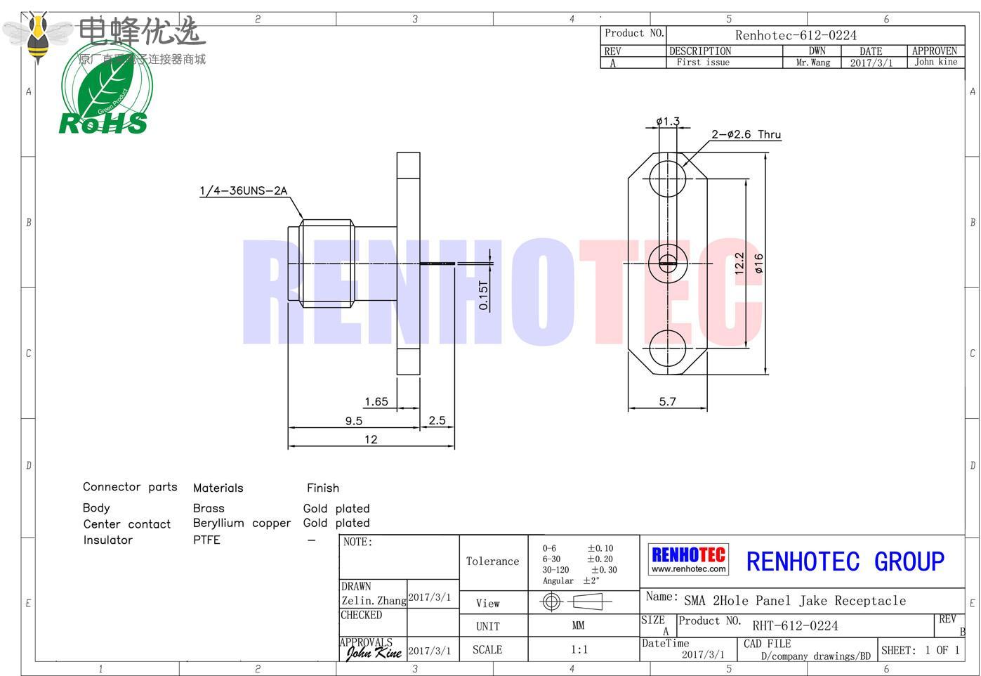 接RG142,RG405线缆时为170 V rms - 中心接触电阻:≦ 6.0mΩ (Milliohms max.)