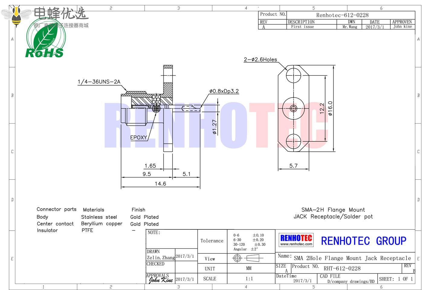 接RG142,RG405线缆时为170 V rms - 中心接触电阻:≦ 6.0mΩ (Milliohms max.)