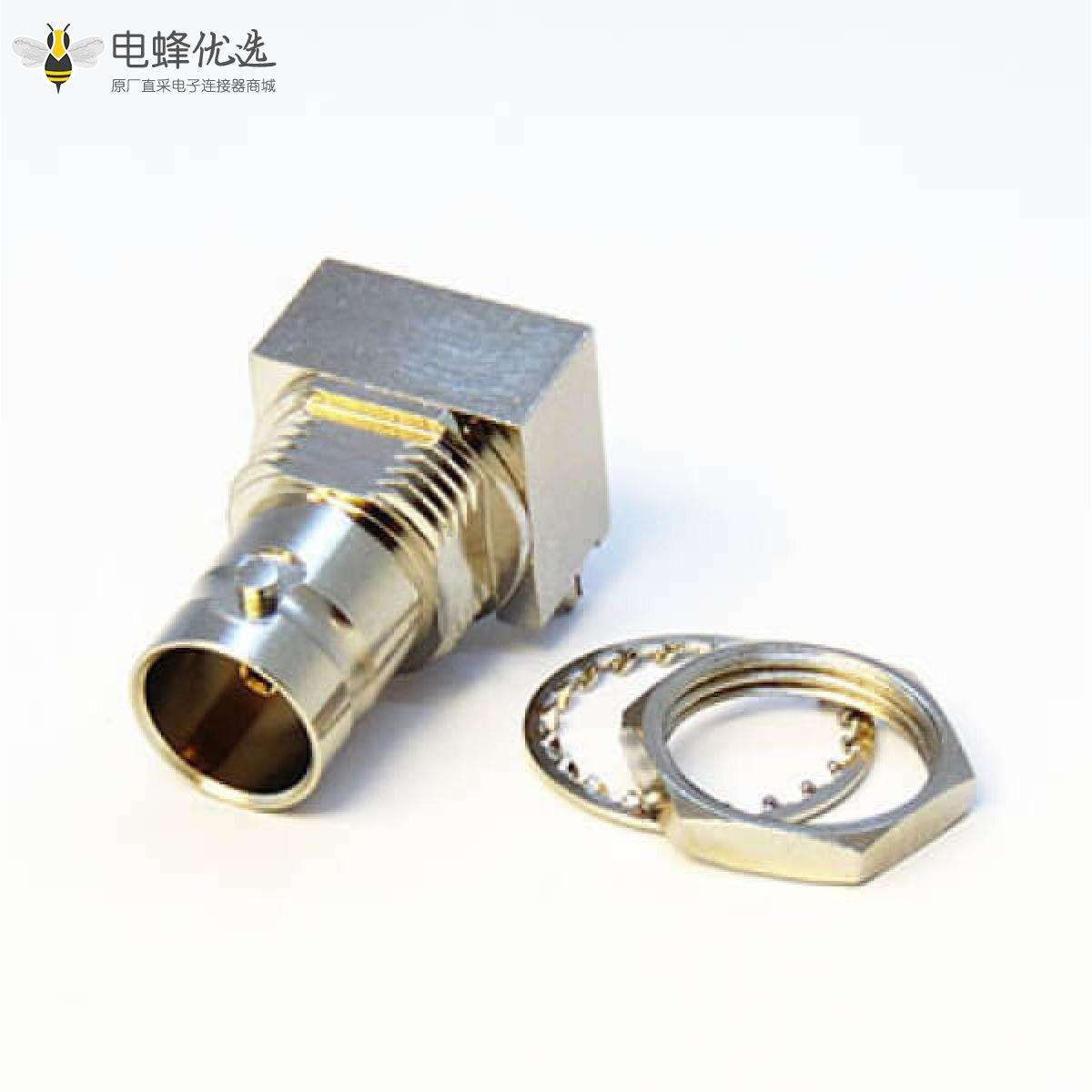 - BNC连接器, 母头, 弯式, 接PCB板, 穿墙安装, 75欧姆, 镀镍;