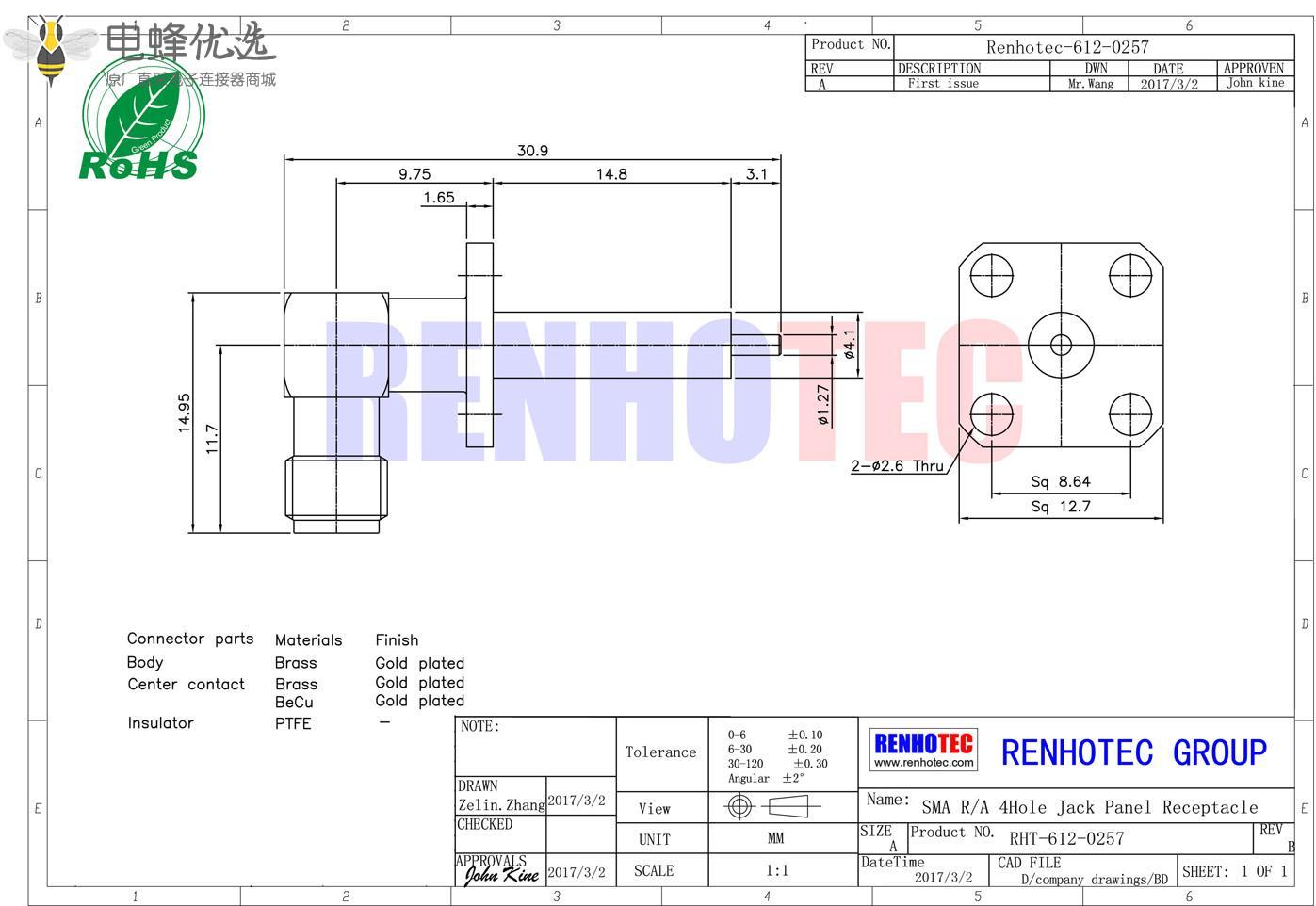 - sma连接器, 面板安装,弯式,母头, 4孔法兰, 延长铁氟龙;