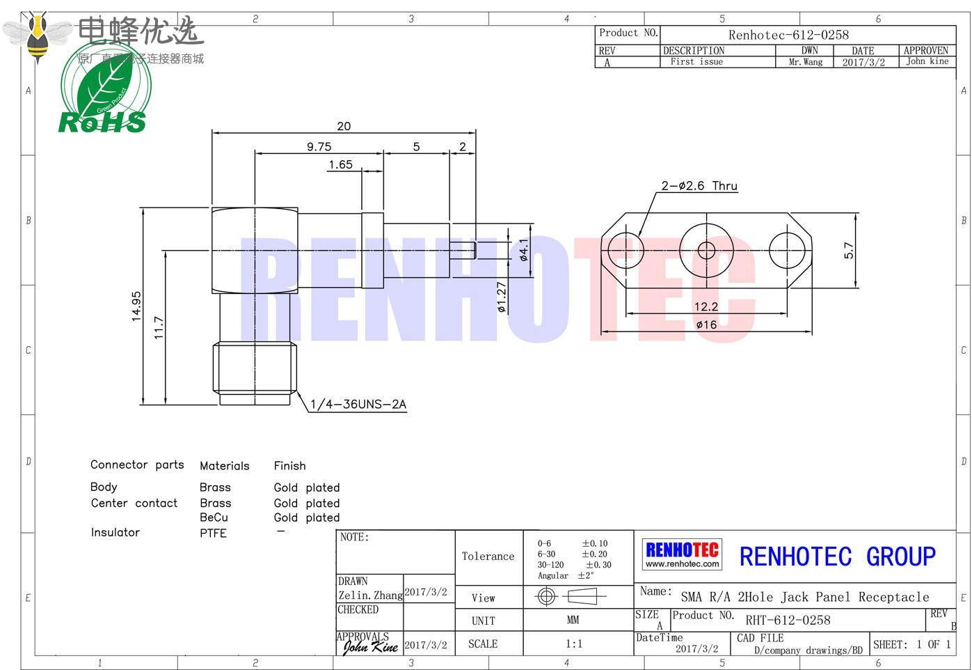 - sma连接器, 面板安装,弯式,母头, 2孔法兰;