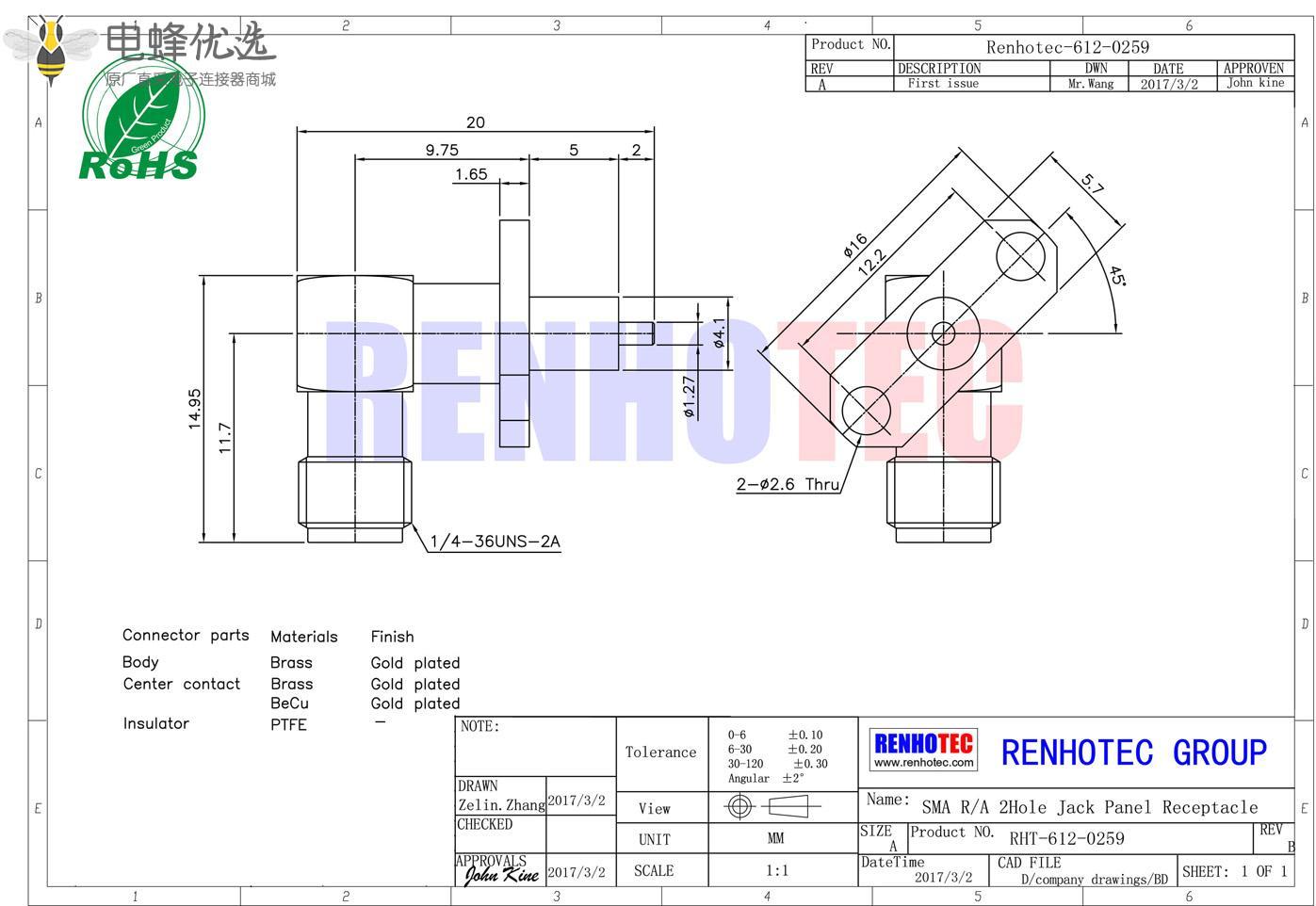 - sma连接器, 面板安装,弯式,母头, 2孔法兰, 延长铁氟龙;