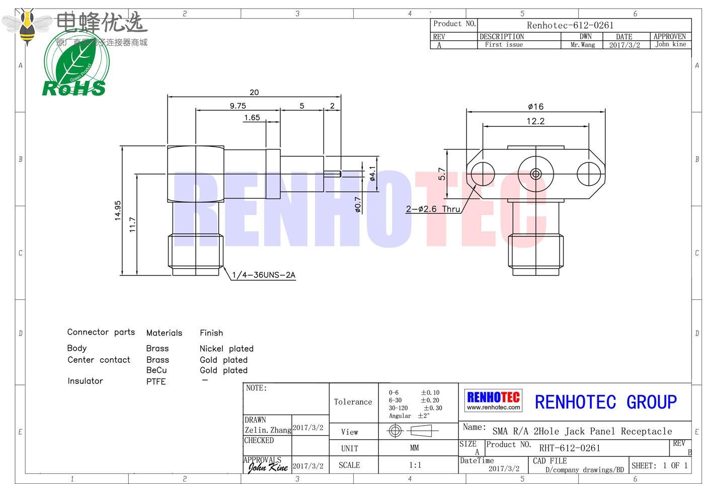 - sma连接器, 面板安装,弯式,母头, 2孔法兰, 延长铁氟龙, 不锈钢;