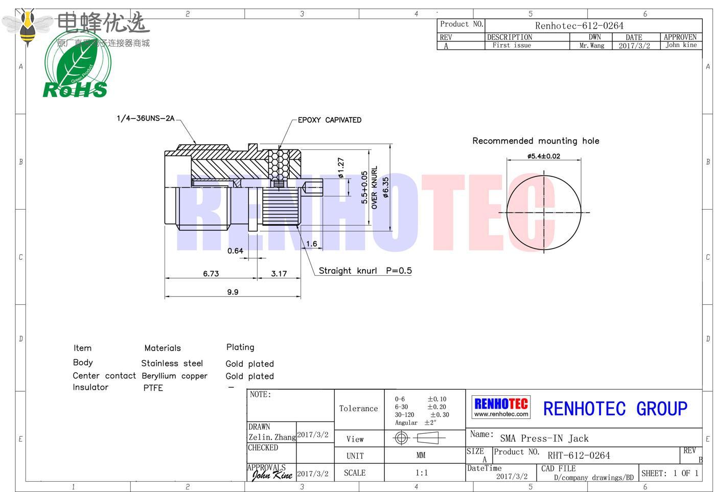 接RG142,RG405线缆时为170 V rms - 中心接触电阻:≦ 6.0mΩ (Milliohms max.)