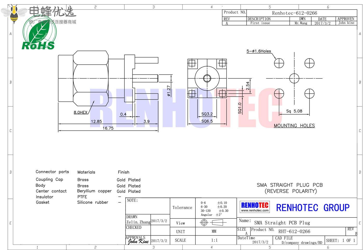 接RG142,RG405线缆时为170 V rms - 中心接触电阻:≦ 6.0mΩ (Milliohms max.)