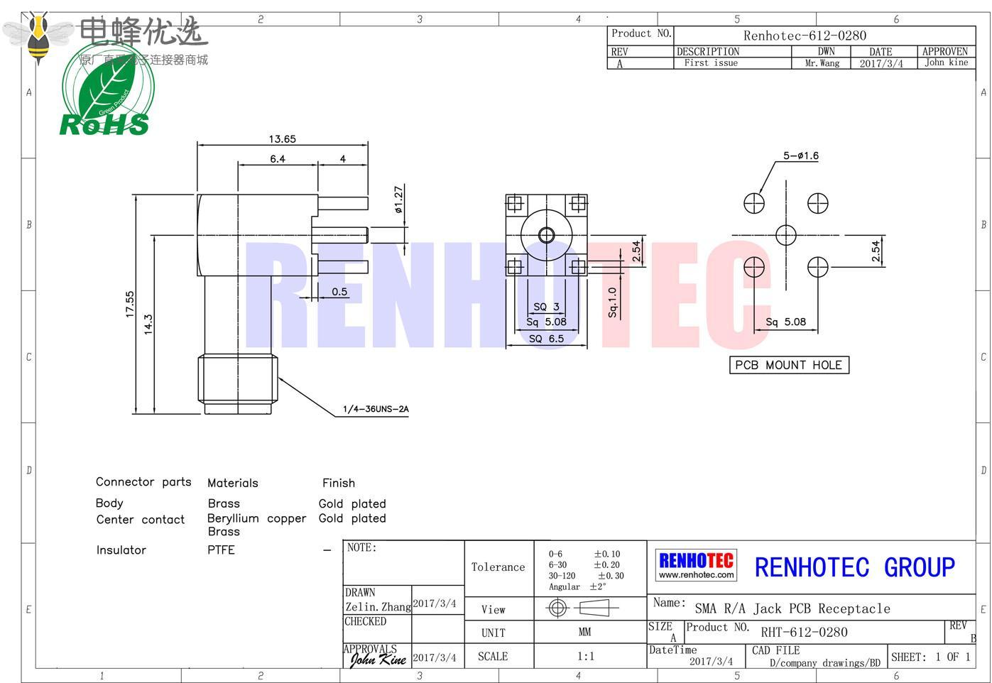接RG142,RG405线缆时为170 V rms - 中心接触电阻:≦ 6.0mΩ (Milliohms max.)