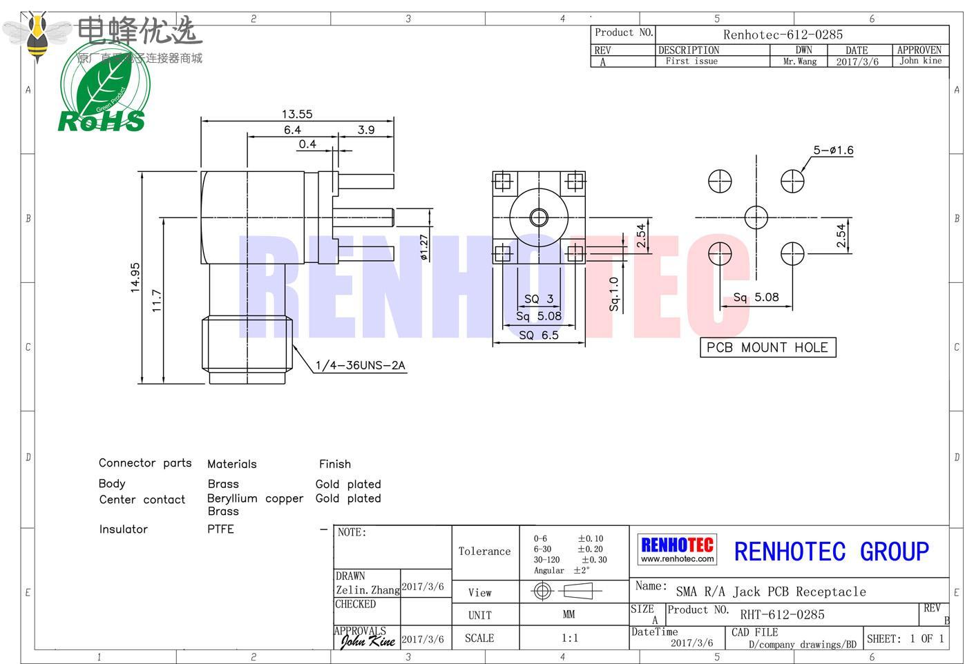 接RG142,RG405线缆时为170 V rms - 中心接触电阻:≦ 6.0mΩ (Milliohms max.)