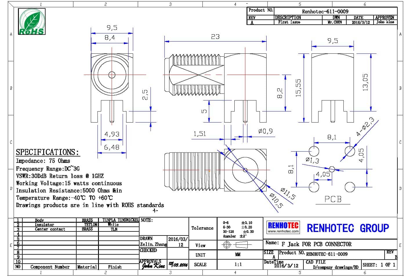 - 中心接触电阻: ≦ 10 mΩ (Milliohms max.)