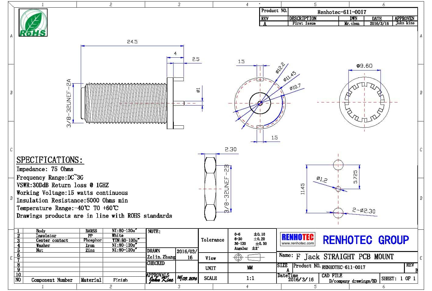 - f连接器,pcb板,母头,75欧,穿墙,直式;