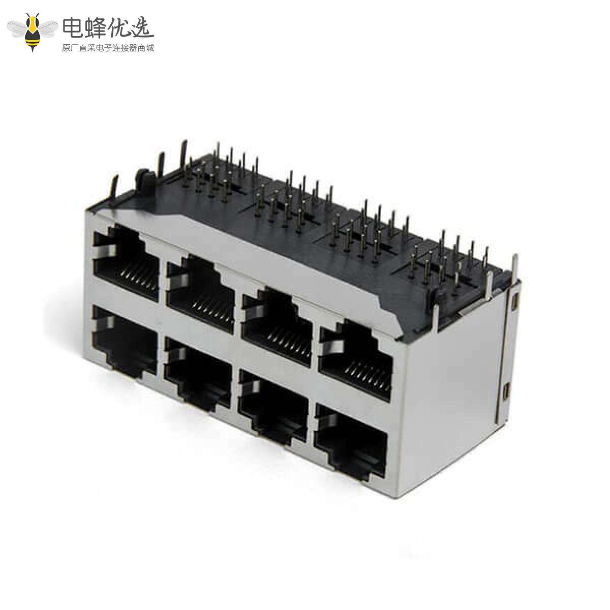 - RJ45连接器,插座,8P8C,8口,1*8,单层,弯式90°,镀金,插孔,PCB板安装,屏蔽,不带灯,不带滤波器,不带POE,不防水;