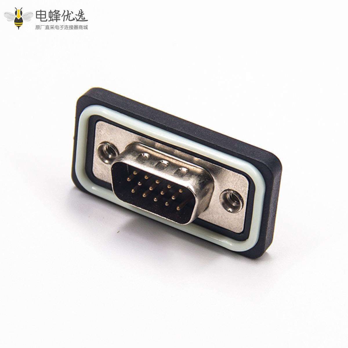 - 防水D-sub,插头,15针,3排,单端口,直型,车针,镀金,垂直PCB安装,后铆螺母,IP67,不带滤波;