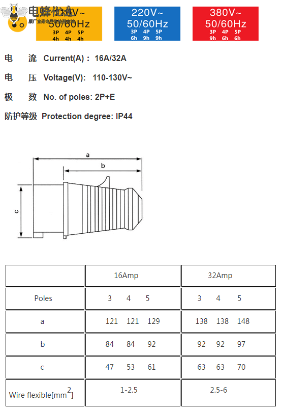 3芯,32A,220V-250V,插头,IP44,蓝色;