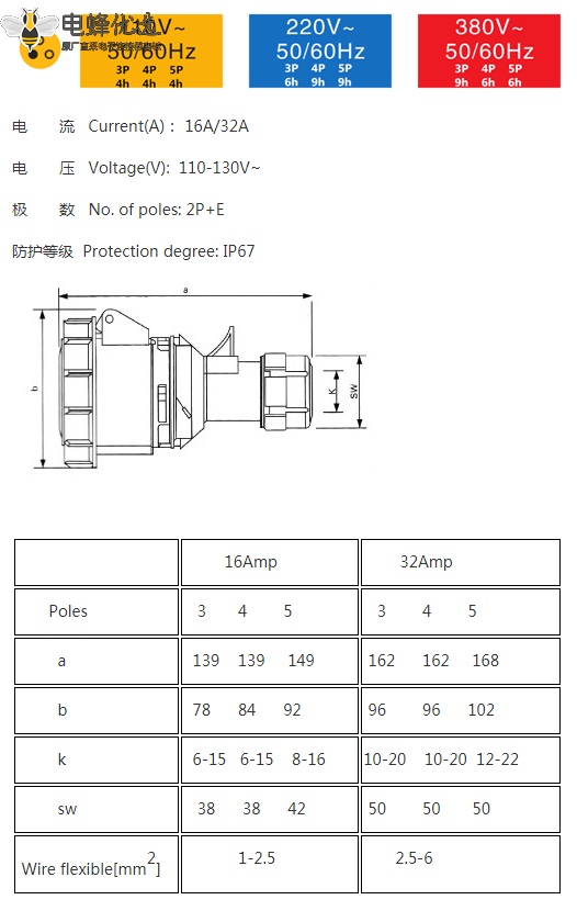 5芯,16A,380V-415V,连接器,IP67,红色;