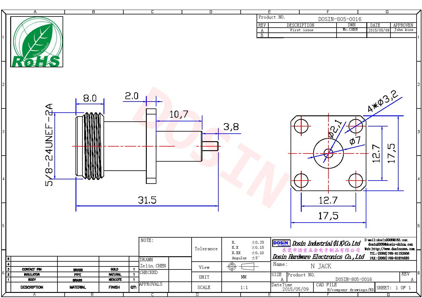 - 中心接触电阻: ≦ 1.0 mΩ (Milliohms max.)