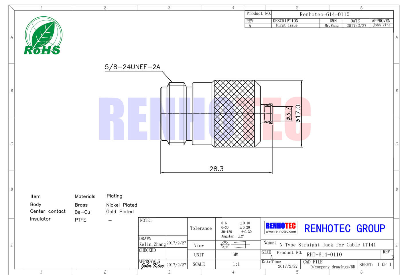 - n连接器,同轴线缆,母头,50欧,直式,焊接,UT085;