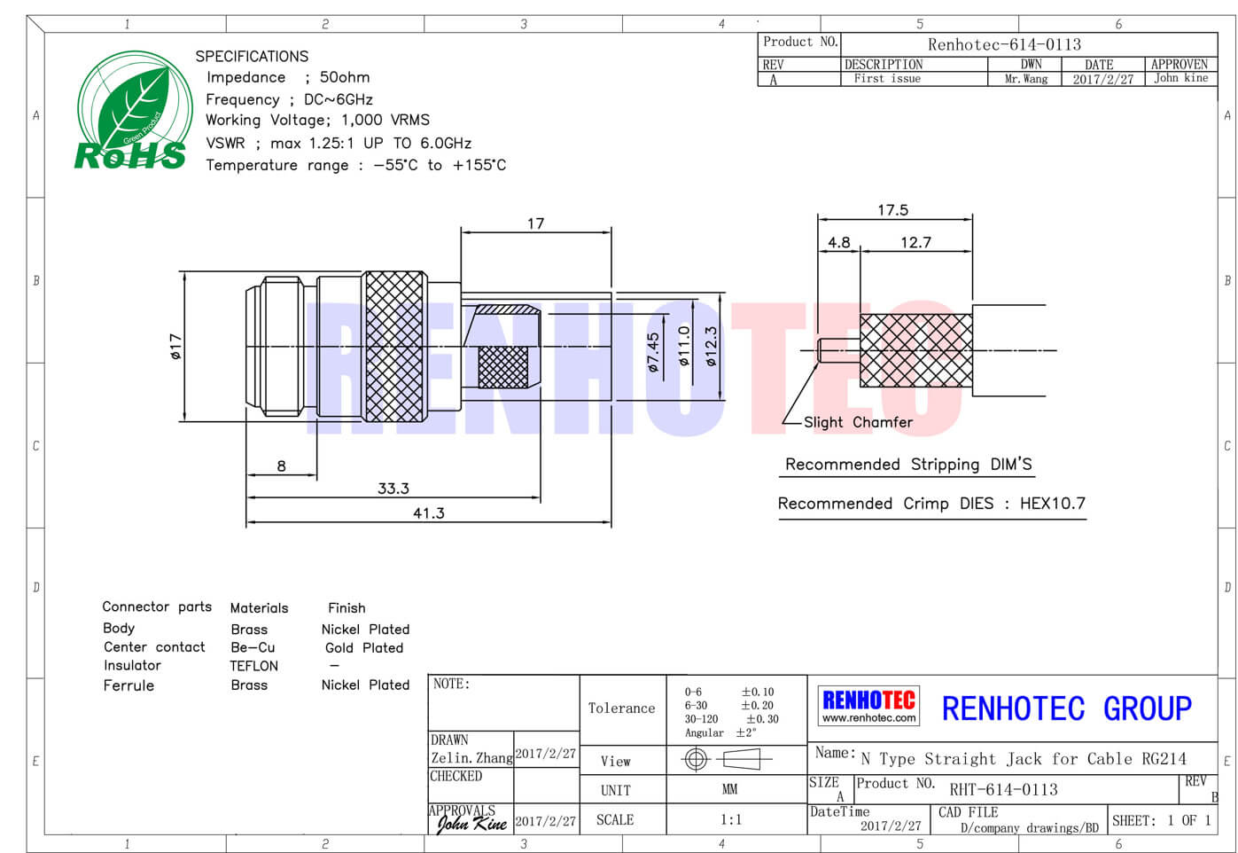 | Center Contact | Be-Cu | Gold Plated | |