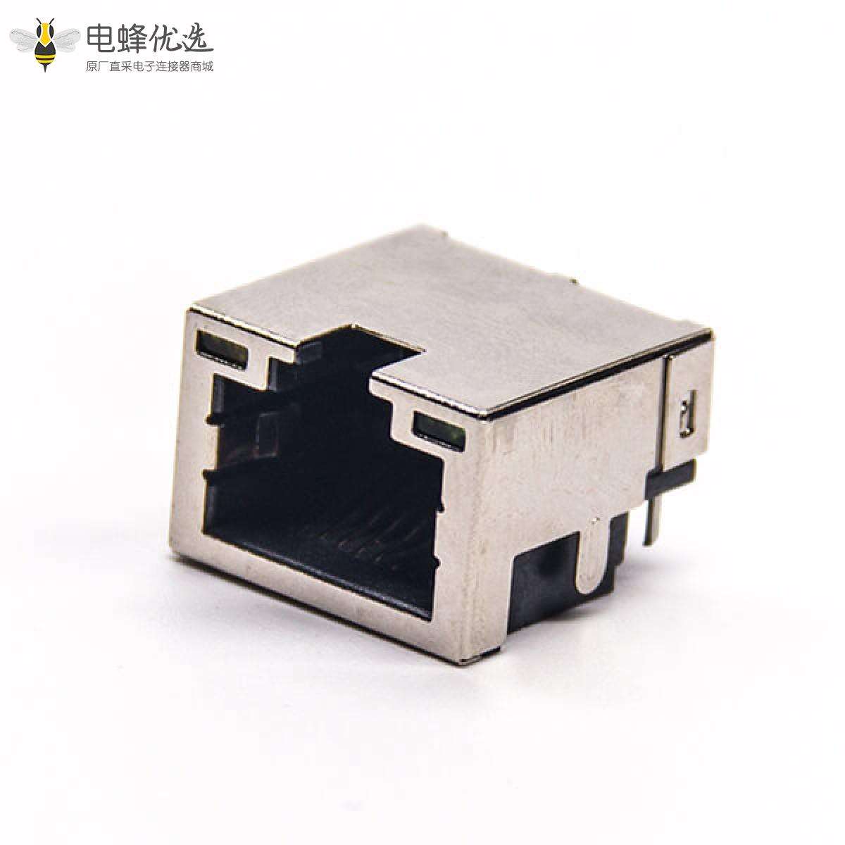 RJ45插座,8P8C,单端口,1*1,弯式90°,触头镀金,沉板,插板,PCB板安装,带屏蔽,带灯,不带滤波;