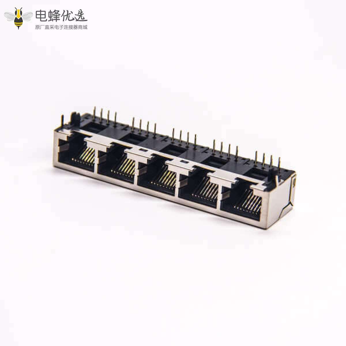 RJ45插座,8P8C,5端口,1*5,弯式90°,触头镀金,插孔,PCB板安装,带屏蔽,不带灯,不带滤波;