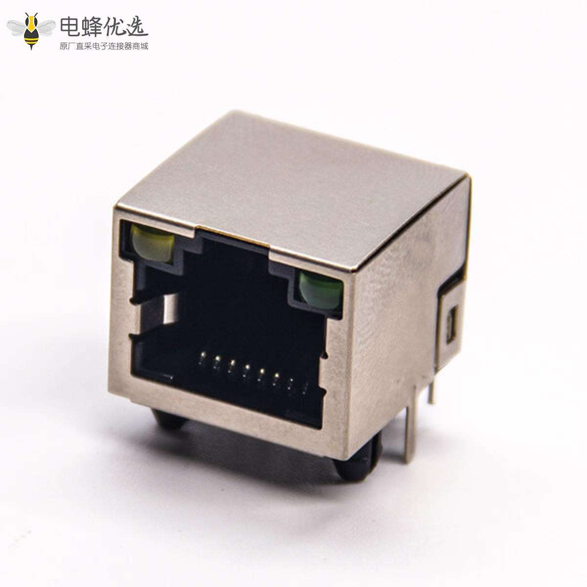 RJ45插座,8P8C,单端口,1*1,弯式90°,触头镀金,插孔,PCB板安装,带屏蔽,带灯,不带滤波;
